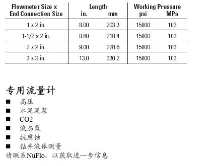 WECO 1502 型 Union 连接方式 通常使用在高压油井的流量测量场合上。 1” 、 1-1/2” 和 2” 流量计的 Union 连接尺寸为 2” , 3” 流量计的 Union 连接尺寸为 3” ,所有的 1502 型流量计均有两个电磁检出单元的适配器。 专用流量计 高压 水泥泥浆 CO2 液态氮 抗腐蚀 钻井液体测量 请联系 NuFlo ,以获取进一步信息 规格参数Specifications: