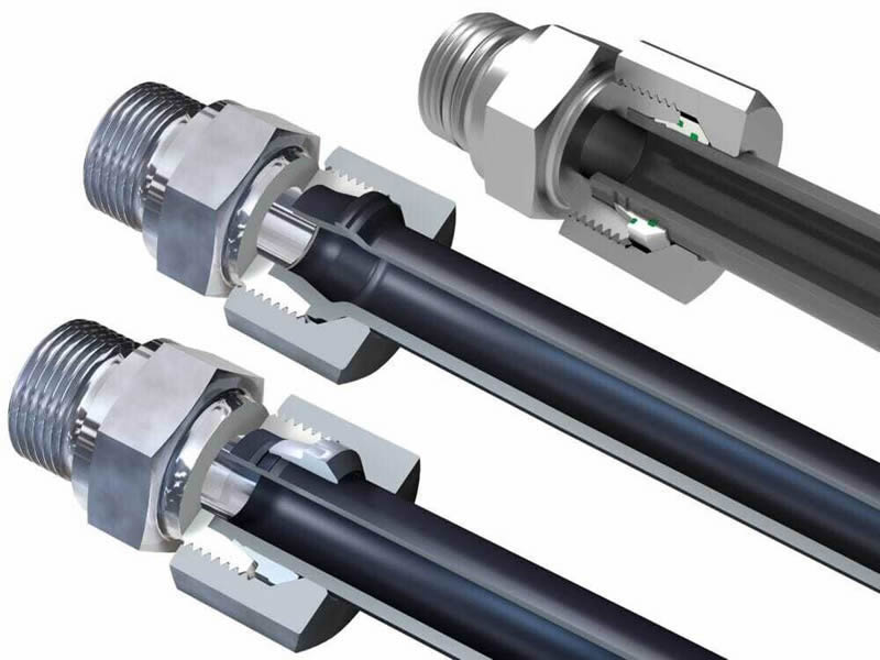 在WALTERSCHEID卡套式管接头的安装过程中,WALTERSCHEID卡套以它的两个尖的内刃嵌入管子的外壁,由此形成了形状式管子连接。同时通过压紧螺母的内锥面将卡套的锥形肩挤压变形,使其夹紧在管子外壁上,使整个接头达到能够承受弯曲应力的目的。