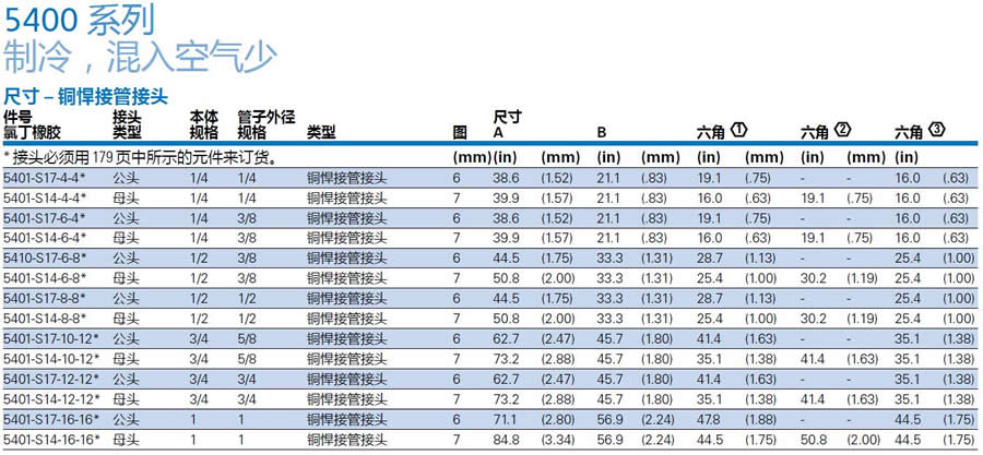 5401-S17-12-12* 公头 3/4 3/4 铜悍接管接头 6 62.7 (2.47) 45.7 (1.80) 41.4 (1.63) - - 35.1 (1.38)