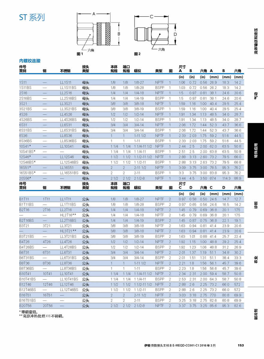 EATON Hansen ST系列是一种无阀门快速接头,用于需要最大流量及最少压降的领域。EATON Hansen ST系列直通式快速接头应用:ST系列提供的大流量被用于压力清洗装置、蒸汽清洗、液体运输、模具冷却线路及化工。Eaton ST系列是一种直通接头,设计用于要求压力损失和不需要阀的应用场合,这些接头适合各种各样和多用途的流体输送类型的系统。