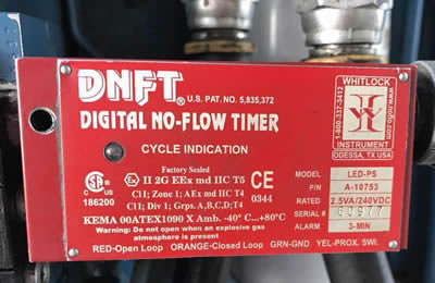 DNFT performs monitoring and shutdown functions like No-Flow, Low-Flow or Excessive-Flow for Divider-Block Lubrication Systems. The DNFT is a totally enclosed solid state electronic device for detecting Slow-Flow and No-Flow on in-line progressive lubrication systems. The Digital No-Flow Timer incorporates a crystal oscillator to accurately monitor the cycle time of the lubrication system enabling precision timed shutdown capability. An internal Lithium battery powers it, which is easily replaceable. The Digital No-Flow Timer is an ISO 9001 certified product and the ISO certification can be viewed here. All Digital No-Flow. Timers also come with a 3 year warranty.