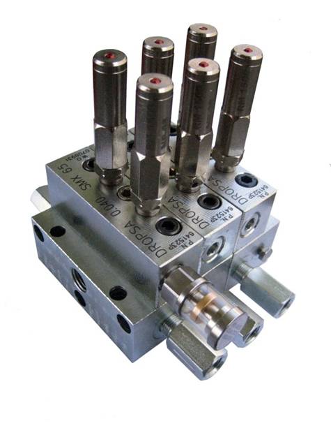 · 分配器:分配器由标有数值和字母的各个分配阀组成,最少需要三个分配块。其特点为各个出油口的润滑油排量按照标定数值比例分配到每个润滑点上,可以根据需要灵活组合阀块的数量,整个分配器上油路相同,有一个阀块不能工作的话其它所有的阀块都不能工作,便于集中控制。