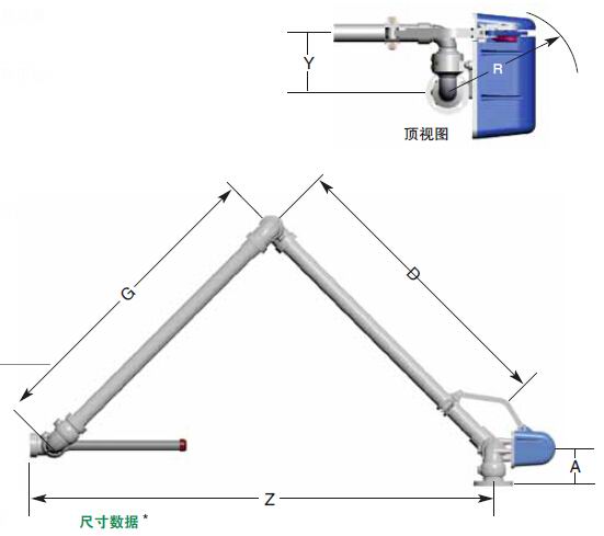 “A”字型框架是一种较为常见的灌装臂配置型式。它具有良好的灵活性、可达距离长,且使用操作十分方便。它可在高度或倾角方面调整到车辆装卸过程中的任意位置。灌装臂可以向上收起,以接近垂直的位置收藏起来,并能方便地转动,从而朝装车站的任意一侧进行灌装。
